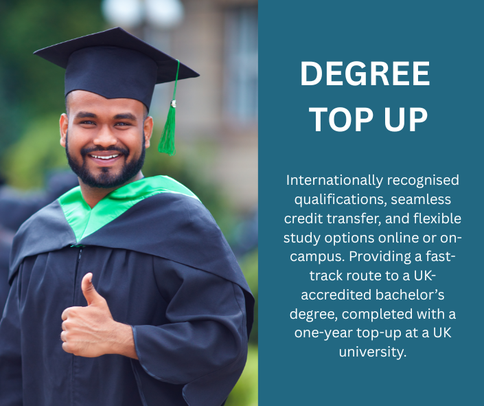 The top-up degrees are awarded by accredited UK universities and are identical in title, content, and recognition to those earned by on-campus students making them recognised and respected.